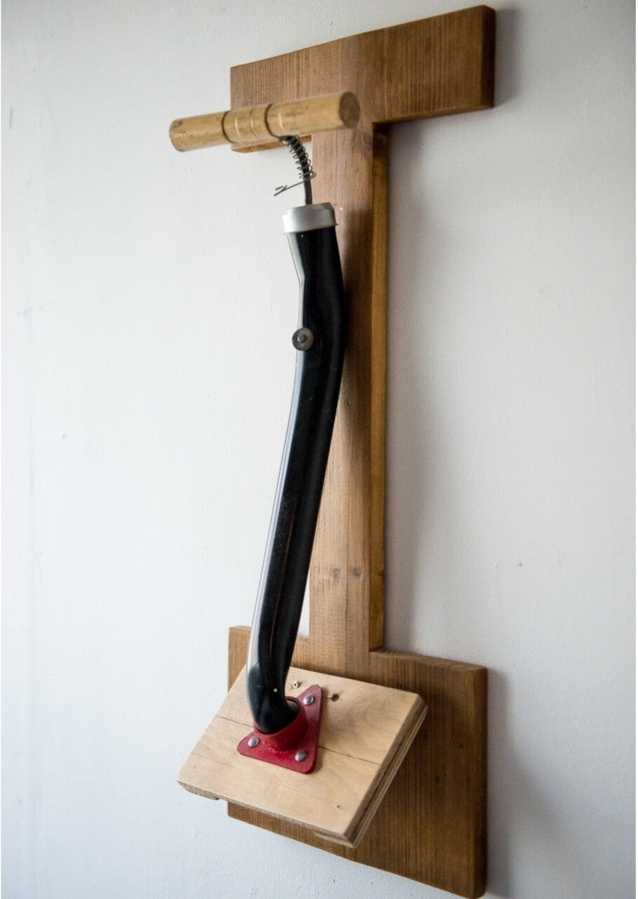 Postcard of bicycle pump in a coffin, Postcard of Crucified Pump, Postcard of sideview installation and Postcard of the Mantrap. All shots taken on Exposure 2024 at Pastoe fabriek, HKU Utrecht, 25-31 june by Dennis Goedbloed from Deegee.net. Artist Reinier van der Wal